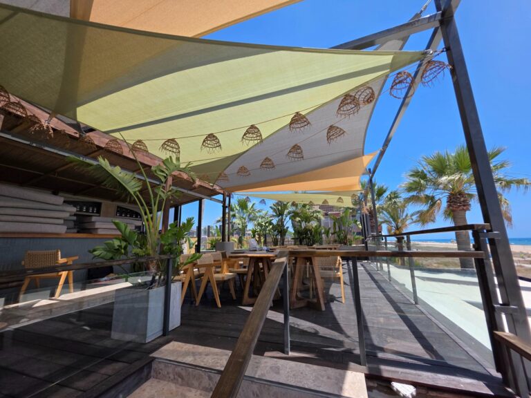 Se instalaron 9 velas, que consiguen dar sombras en una zona totalmente soleada. Esta opción ofreció flexibilidad, confort y un diseño elegante que se integra con el entorno costero.